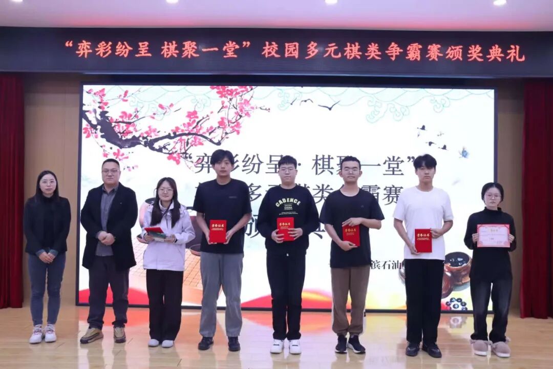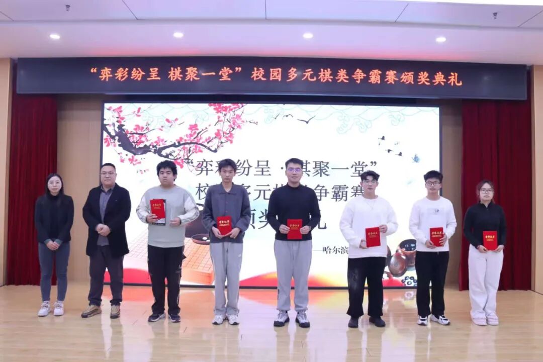 荣耀加冕: 以棋弘文,薪火相传。比赛结束后“奕彩纷呈,棋聚一堂”校园多元棋类争霸赛颁奖典礼隆重举行。校团委书记陈志勇、人居环境学院辅导员王铁媛亲临现场,为脱颖而出的获奖选手送上荣誉——双手递上的荣誉证书与闪耀的定制奖杯,定格下属于青春的高光时刻,随后与全体获奖者并肩合影,将这份喜悦与荣耀永久留存。
