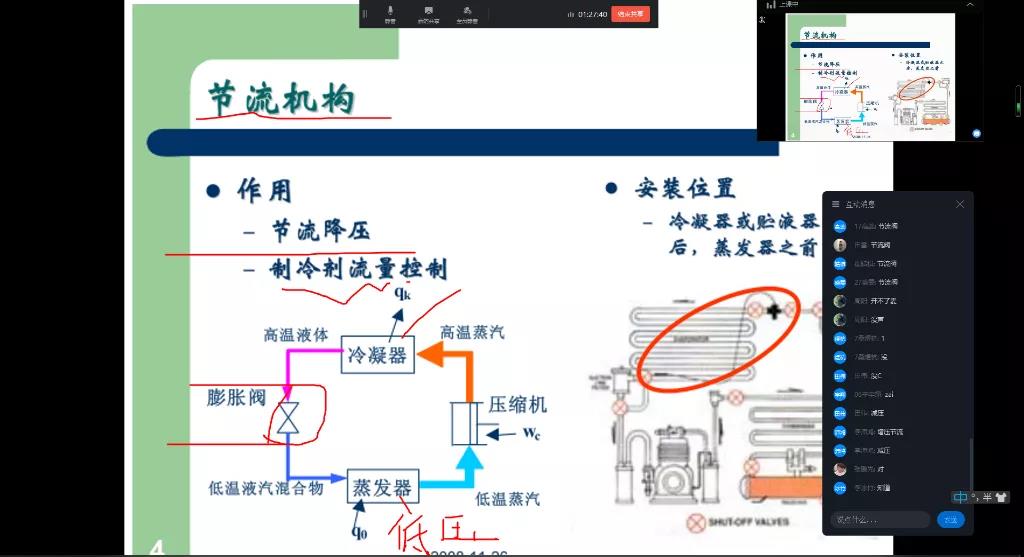 这次的课程全部采用钉钉平台视频会议形式,课前精析教材,精设课件, 精心制作的PPT课件内容丰富,图文并茂,动画生动,通过把制冷装置复杂的部件结构图和工作原理以实物图片、动画的形式展现出来,对流体的流动方向,复杂结构部件的移动,压力、温度等参数的变化表现直观,带入感强。容易让学生理解并且印象深刻,便于强化记忆,收到良好的教学效果。