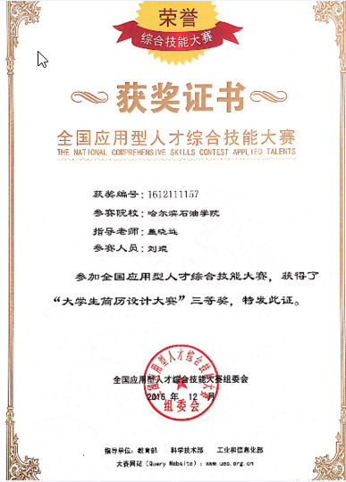 土木工程学院院长盖晓连高度重视此项大赛,自2016年9月15日接到全国应用型人才综合技能大赛组委会的参赛邀请函后,院长盖晓连进行了比赛的布置工作,安排赵宇老师负责大赛的赛前准备和跟进工作。学院共组织三支毕业生队伍参加了此次比赛,经过参赛报名、作品提交、网络投票、产品初审和网络二次投票等五个环节的角逐,最终由盖晓连老师指导的“土木一队”刘琨同学、赵宇老师指导的“土木二队”霍庆超同学、李莹娟老师指导的“土木三队”潘善文同学,皆获得全国应用型人才综合技能大赛“大学生简历设计大赛”三等奖。