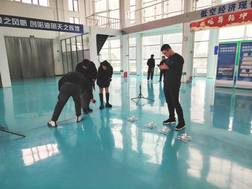 培训过程中,哈尔滨达尚科技有限公司的培训师凭借其丰富的行业经验和专业知识,通过线上直播,深入浅出地讲解了Fylo无人机电脑scratch PC端和Fylo APP端编队的操作技巧,以及安全注意事项。理论授课结束后,培训进入紧张而精彩的无人机编队实际操作环节。在智能建造综合实训馆内,培训师指导教师们进行无人机编队飞行操作。