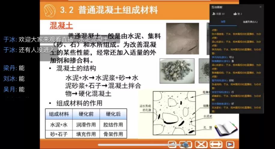 基本情况:本课程是土木工程专业的一门专业基础课,着重介绍主要土木工程材料的品种、技术指标、检测方法、评定指标、特点及应用。通过学习使学生能够具有合理判断、选用主要土木工程材料的基本能力和意识,并掌握一定的分析、评价材料性能及改善材料性能的基本技能。3月2日开课以来,通过钉钉+学习通+QQ多平台网上授课,每周4课时,应到课84人数,实到课84人数,到课率100%,教学运行平稳。