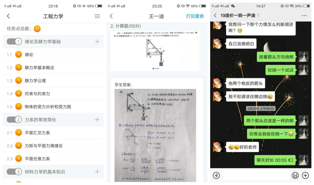 课前将PPT等资料发给学生,作为学生课前预习的准备资料,并要求学生带着问题听接下来的直播课。每节课前对上节内容进行复习,如果网络畅通则采用超星学习通进行测验,检验学生对上节知识点的掌握程度。并在学习通上为学生推荐了如同济大学、东南大学的工程力学的网课(中国大学MOOC)作为学生学习参考视频。