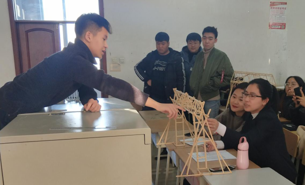 答辩环节由14组设计团队的学生代表分别对作品方案比选、作品制作的可操作性、结构体系的选择及各组模型的特色、团队协作等方面进行汇报,并现场对本组模型进行称重及加载试验,以验证模型的承载能力。指导老师针对每组学生的答辩及模型设计进行针对性地提问,考察同学们在设计过程中对专业知识、设计方法的掌握及团队中各小组的协调能力。