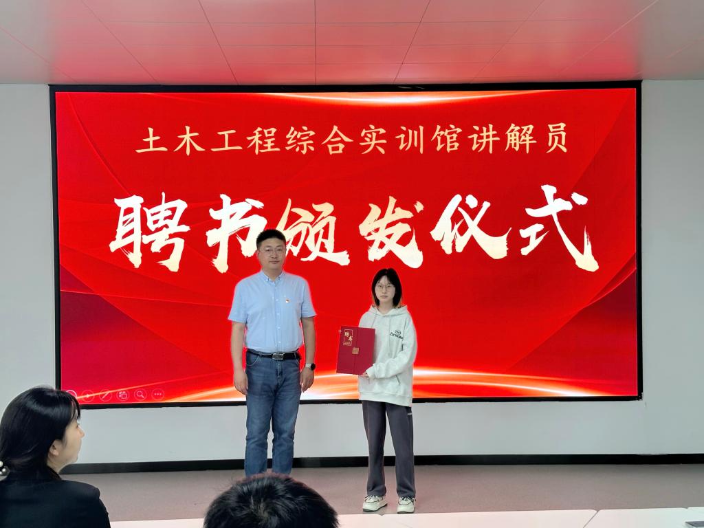 为提升学院土木工程综合实训馆学生讲解员队伍的工作热情和业务能力,同时鼓励和肯定同学们工作的热情与努力付出,2024年6月14日中午,土木工程学院在实训馆多功能教室开展了土木工程综合实训馆学生讲解员聘书颁发仪式。学院党总支书记宋旭、指导教师管艺濛出席此次活动。