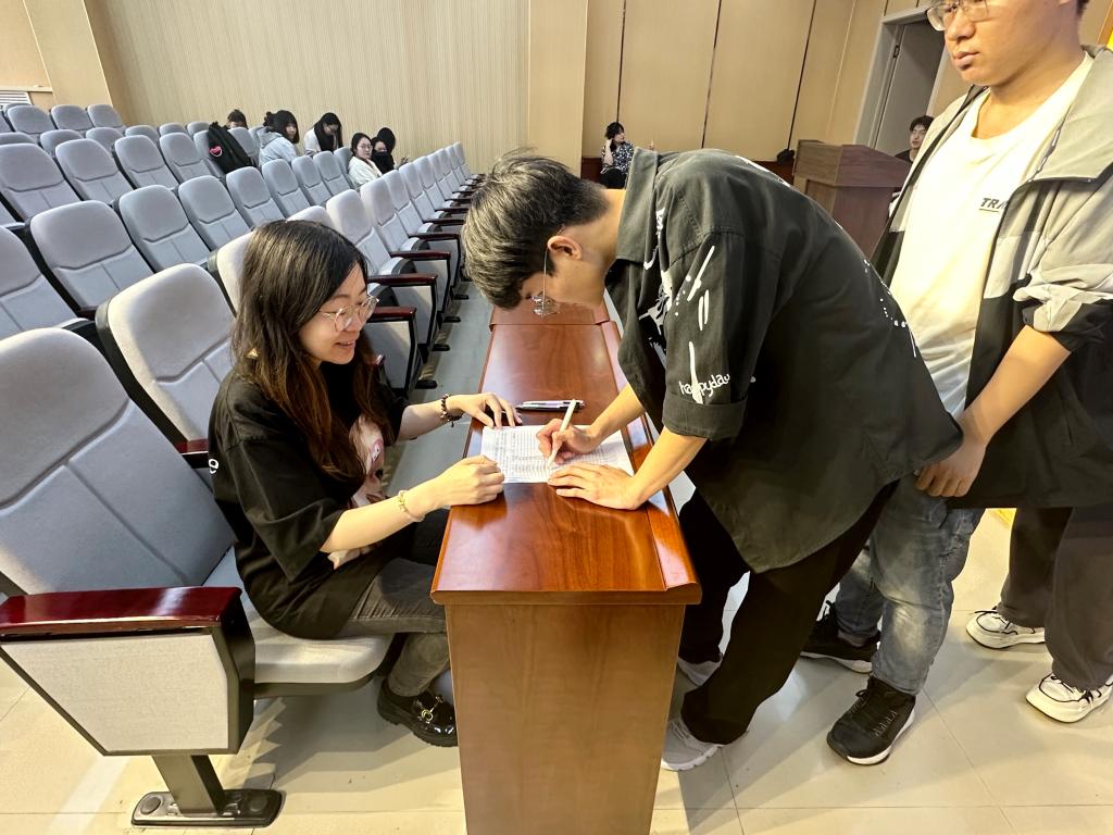 会议结束后,参加全国大学外语四、六级考试的同学们现场签订了诚信考试承诺书,增强了同学们诚信考试的纪律观念,规范了考风考纪。