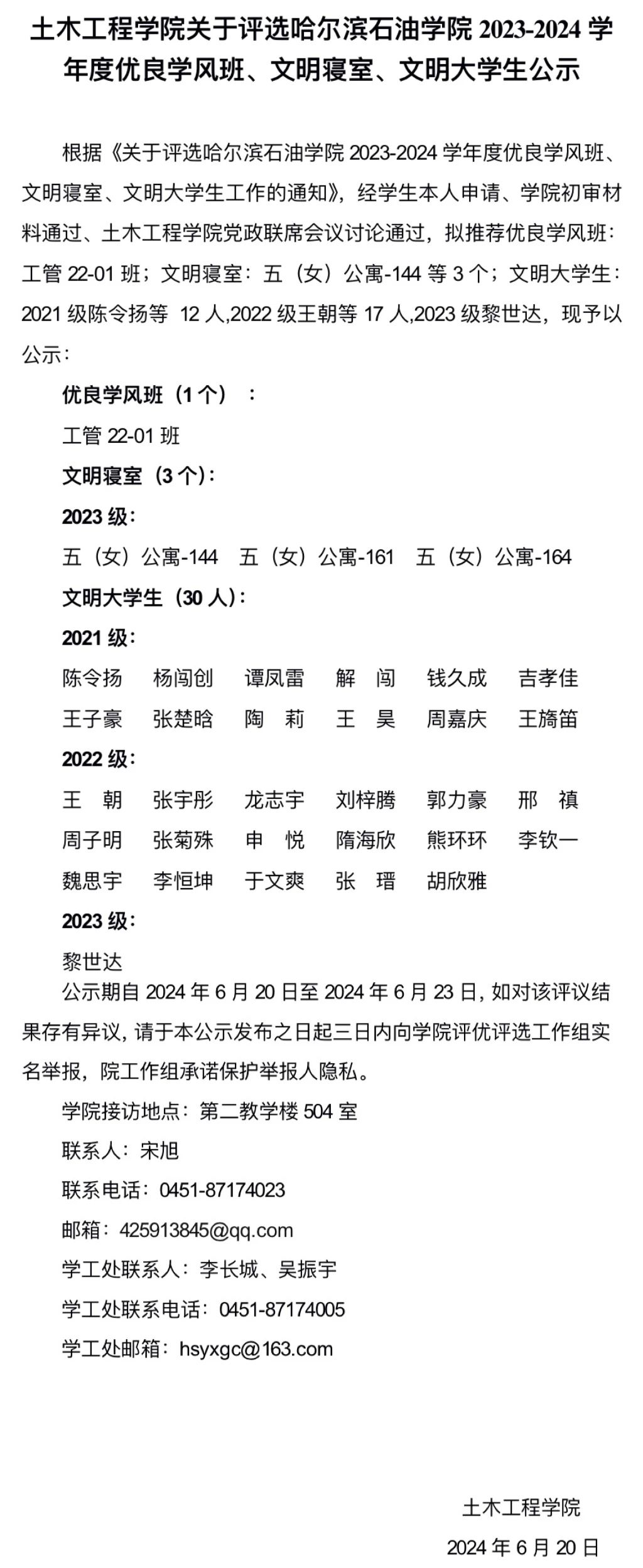 我院关于评选欧博abg游戏登录入口2023-2024学年度优良学风班、文明寝室、文明大学生公示
