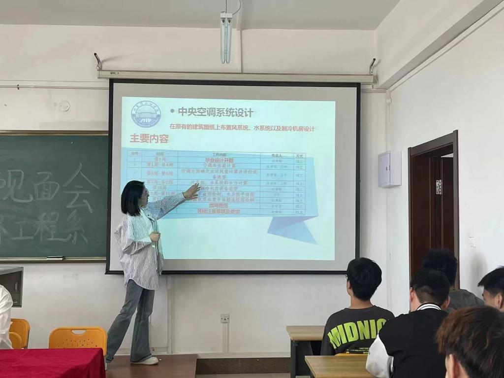 为进一步落实应用型人才培养目标,有效落实2025届建筑环境与能源应用工程毕业设计工作,确保毕业设计高质量、平稳有序开展。2024年5月21日中午,土木工程学院建筑环境与能源应用工程专业召开2025届毕业设计师生见面会。此次会议由赵婧瑜系主任主持,王昕、张辉、安晓星、马冰奇参加会议。