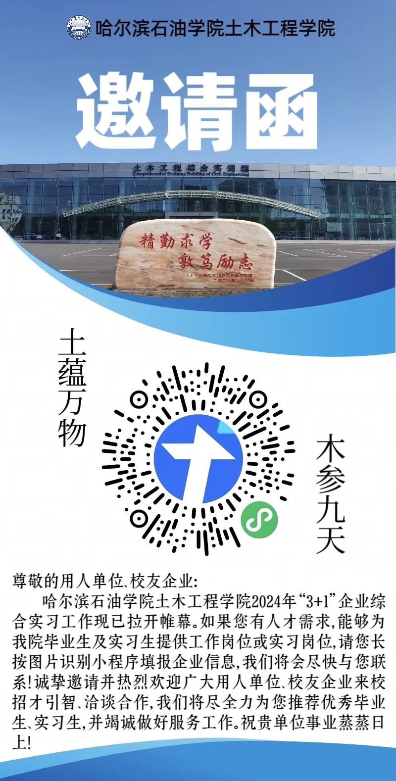 欧博abg游戏登录入口土木工程学院2024年“3+1”企业综合实习工作现已拉开帷幕。如果您有人才需求,能够为我院毕业生及实习生提供工作岗位或实习岗位,请您长按图片识别小程序填报企业信息,我们将会尽快与您联系!诚挚邀请并热烈欢迎广大用人单位、校友企业来校招才引智、洽谈合作,我们将尽全力为您推荐优秀毕业生、实习生,并竭诚做好服务工作。祝贵单位事业蒸蒸日上!