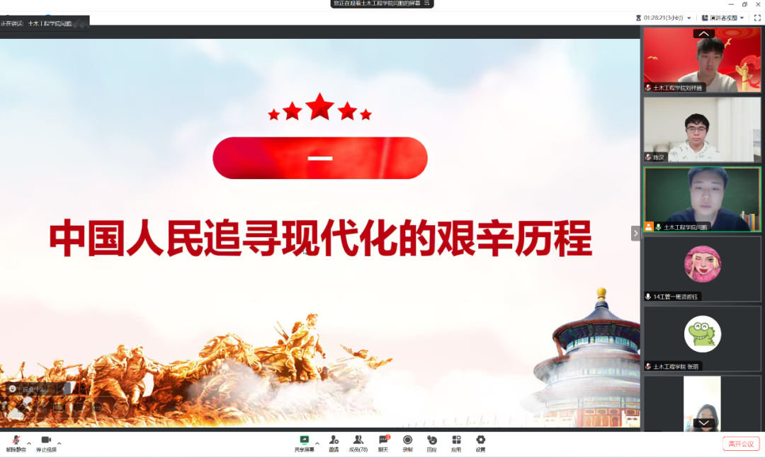 为深入学习贯彻习近平新时代中国特色社会主义思想,深化团员和青年主题教育。2023年1月3日-5日,土木工程学院于线上面向2021、2022、2023年级学生开展主题教育宣讲工作,覆盖人数1030人,此次宣讲由土木工程学院学生组织优秀学生代表为全院团员和青年进行宣讲。