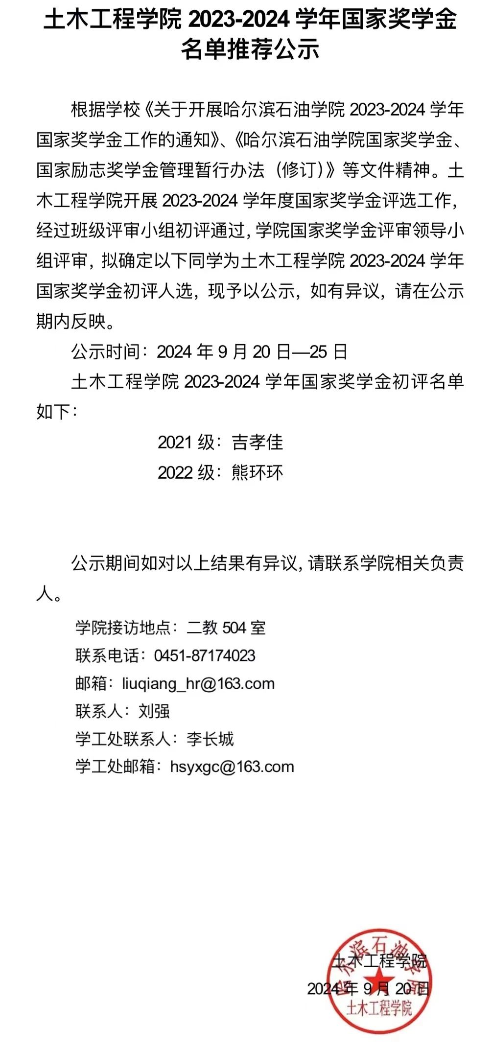 我院2023-2024学年国家奖学金名单推荐公示