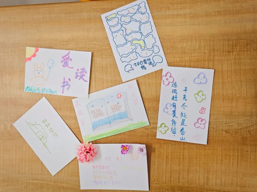 活动伊始,教室里五彩斑斓,琳琅满目的材料整齐地摆放在桌面上,卡纸的丰富色彩、彩笔的多样种类、精致的丝带以及闪耀的贴纸,瞬间点燃了同学们的创作热情。