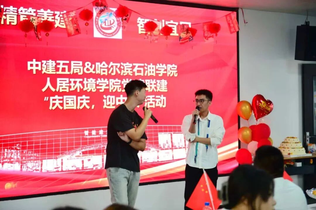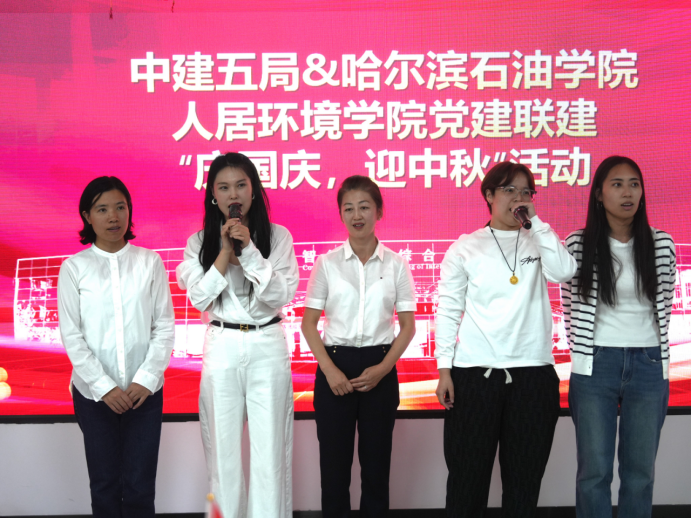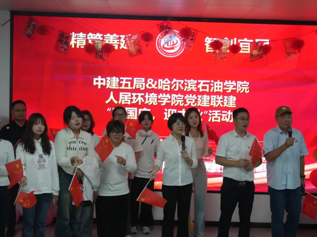 活动尾声,人居环境学院院长郑大宇、党总支书记刘强、副院长荆明野带领全场人员手持国旗起身,齐声高唱《我和我的祖国》。激昂的旋律回荡在现场,真挚的情感随着歌声流淌,将家国情怀深深镌刻在每个人心中。随后的领导寄语环节,中建五局一公司吉黑分公司项目经理刘夫庚表示,此次双节联建活动是校企文化交融的生动实践,为双方后续深化合作筑牢情感基础;人居环境学院党总支书记刘强则强调,将以此次活动为契机,持续加强与中建五局一公司吉黑分公司的联动,让校企合作在文化共鸣中走得更稳、更远。