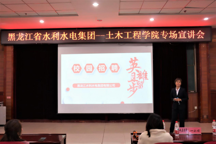 此次宣讲会在企业播放的幻灯片中正式开始。水利水电集团宣讲人就本企业的概况、发展历程、工作环境、人才福利、职业规划等方面进行了介绍。据悉,黑龙江省水利水电集团成立于2015年,是在黑龙江省水利厅所属5户企业,划转到黑龙江省建投集团的基础上组建的大型国有企业集团,现为黑龙江省建投集团旗下控股子公司,主营业务为水利水电工程施工总承包,具有投融资功能。集团现有净资产21.97亿元人民币。集团现具有5个水利水电工程施工总承包壹级资质,及市政公用工程施工总承包壹级、建筑工程施工总承包贰级、机电工程施工总承包贰级、公路工程施工总承包贰级等资质。