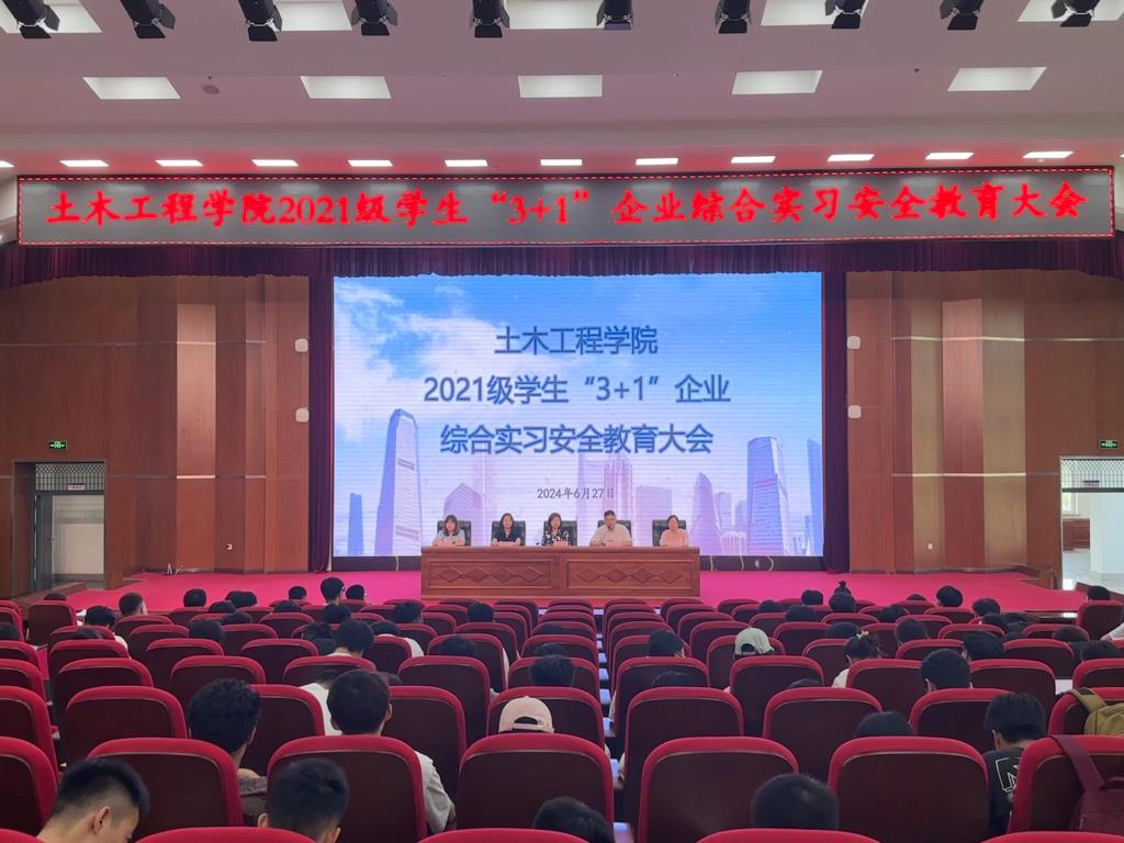 为加强我院学生在“3+1”企业综合实习期间的安全意识和自我保护意识,确保同学们能安全有序地完成实习工作,2024年6月27日中午,土木工程学院在图书馆报告厅召开2021级学生“3+1”企业综合实习安全教育大会。会议由党总支书记宋旭主持,院长盖晓连、副院长荆明野、2021级辅导员赵宇、付诗瑶,2021级全体同学参加会议。