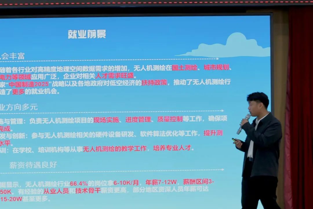 随后,黑龙江中融空间科技有限公司白晓红经理为大家介绍了无人机的发展历史,从早期简单的飞行器到如今高度智能化、多功能化的无人机,其发展历程充满了科技创新与突破。在讲解无人机工程测绘时,她结合土木测绘相关知识,通过实际案例展示了无人机在地形测绘、建筑工程监测等土木测绘场景中的高效应用。她指出,无人机凭借其灵活性、高精度等优势,能够快速获取准确的数据,大大提高了土木测绘的工作效率和质量。