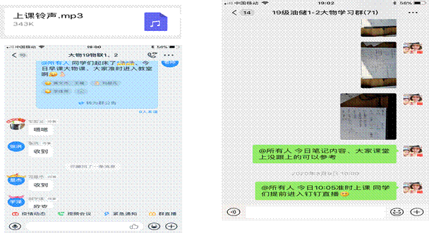 2.线上授课有别于面对面授课的集体作息,学生很难感受到上课的气氛和行动的统一性,因此,我利用微信群、钉钉群等进行上课提醒,利用课前铃声等形式使在线课堂更加具有仪式感。