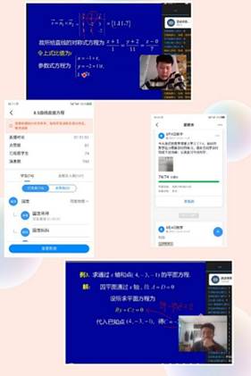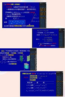 2.具体例题的教学设计:充分利用线上教学的特点,利用好PPT展示动图的功能,对于处理数形结合的问题时,尽量通图像帮助学生分析问题、理解问题(比如设计第八章空间解析几何的PPT时就充分利用到立体图像的展示);为了让学生积极参与到问题的分析和求解的过程中,在设计例题的PPT时,尽量一步一步的做动画,这种仿照黑板板书式进度更易被学生接受,更符合我院学生的能力水平要求。同时,设计适当的点名连麦或学生主动连麦互动,检验学生对知识点的掌握程度,还能起到提醒学生集中注意力,跟紧学习进度的作用。