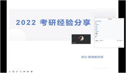 为进一步提高欧博官网学生的考研热情,提高对高等数学、数学建模竞赛的重视,2022年4.月23号晚7点由数理教研部举办的线上考研经验分享交流会。