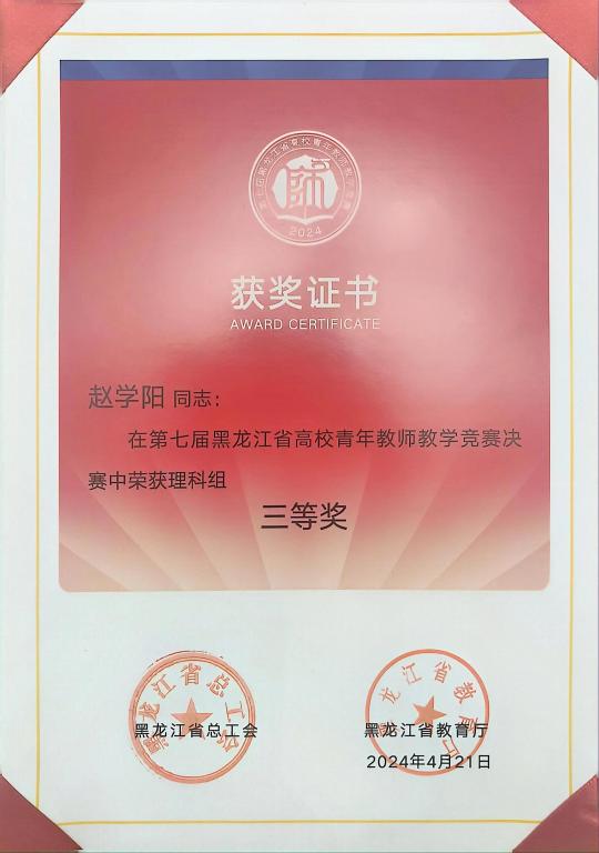 2018年到2024年期间,赵学阳老师指导学生参加全国大学生光电设计竞赛,获东北赛区一等奖三项、二等奖七项;指导学生参加黑龙江省大学生光电设计竞赛,获一等奖七项、二等奖八项;获得第十届全国大学生光电设计竞赛东北赛区优秀指导教师奖;指导学生参加大学生创新创业项目;国家级一般项目一项、省级一般项目两项、省级指导项目一项。