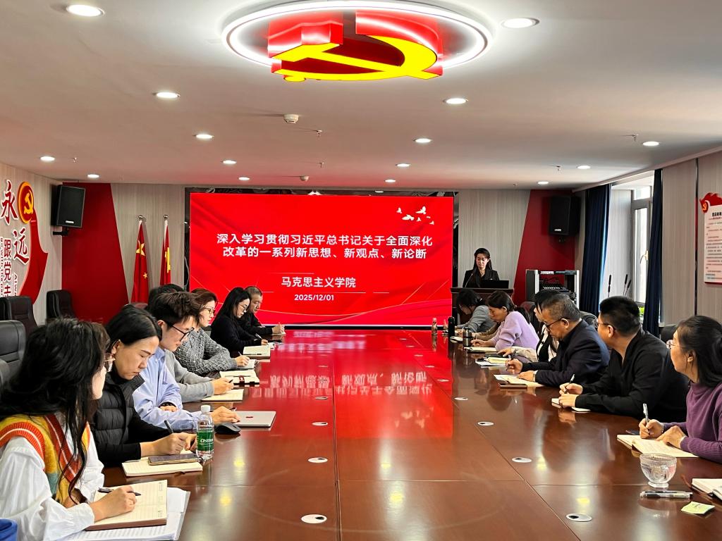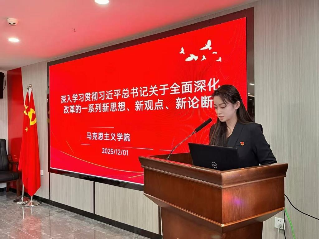 2025年12月1日,马克思主义学院党支部在综合楼1414开展专题理论学习活动,深入学习贯彻习近平总书记关于全面深化改革的一系列新思想、新观点、新论断。本次专题学习由马克思主义学院院长吴卫东主持,马克思主义学院教师李晴主讲,马克思主义学院党支部全体党员参加学习。