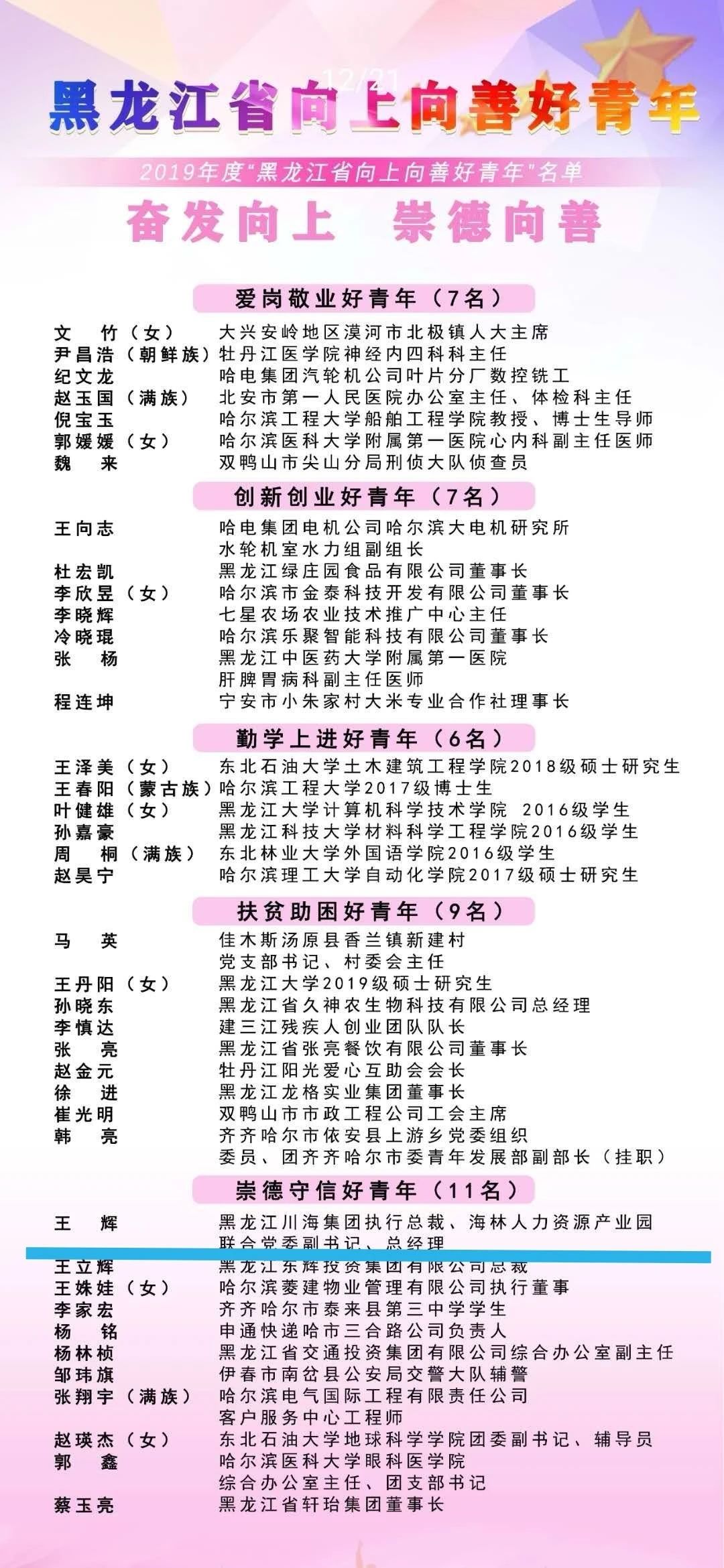 四年育苗桃李,再结硕果添香!欧博abg游戏登录入口2008级优秀校友川海集团执行董事王辉荣获2019年度“黑龙江省向上向善好青年”崇德守信好青年殊荣!