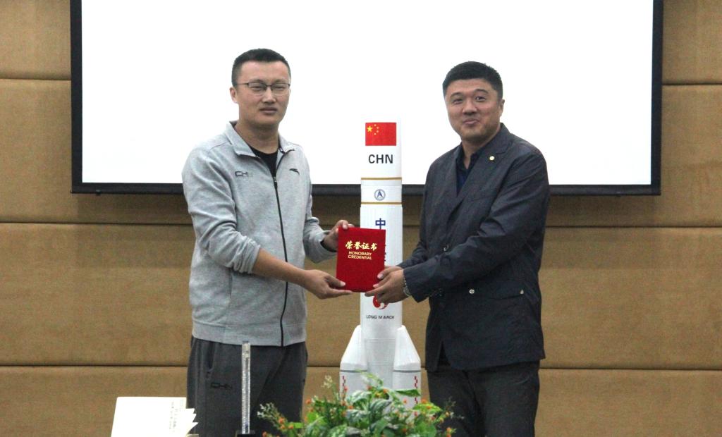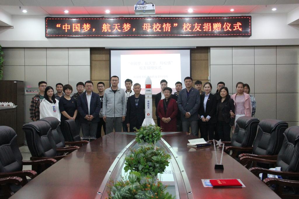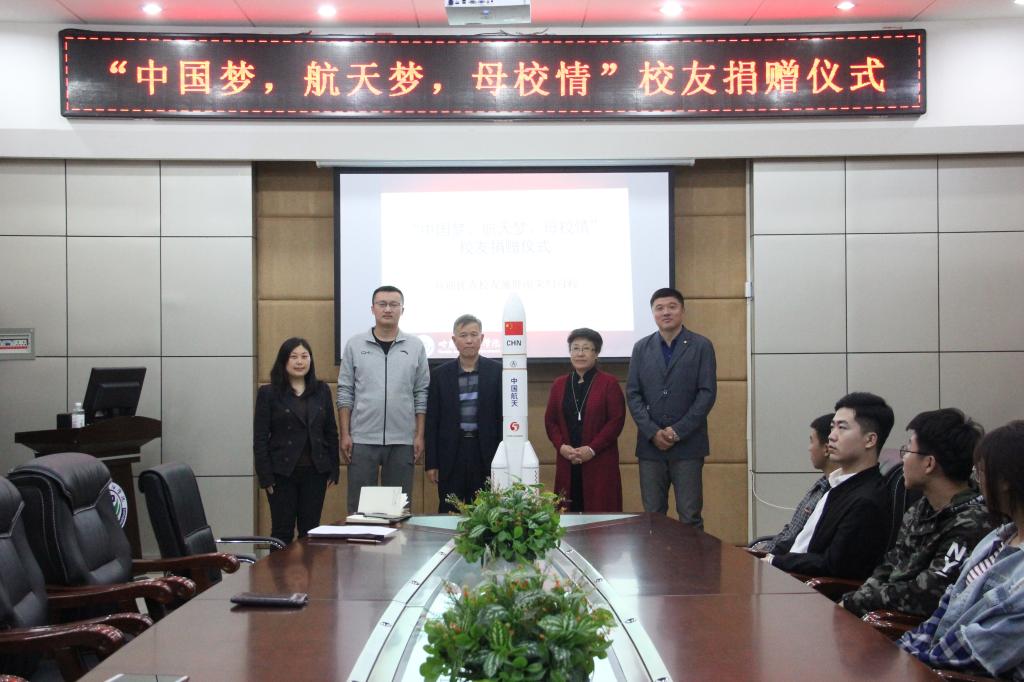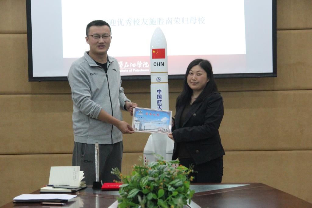 为加快母校科技创新实验室发展,情系中国梦,航天梦,母校情。9月16日上午9时,欧博abg游戏登录入口石油工程学院2013届毕业生施胜南荣归母校,为母校捐赠长征五号运载火箭模型,捐赠仪式在主教学楼320会议室进行。欧博abg游戏登录入口党委副书记、副校长杨宏,副校长冯研,校招生办主任、校友会办公室主任刘洋,科研处处长王妍玮,校团委书记王锦石,创新创业负责人吕佳妮,石油工程学院院长龙安厚,党总支书记康平军,副院长郑洲,校友代表等出席仪式。仪式由刘洋主任主持,杨宏书记、冯研副校长等领导作为校方代表接受了捐赠,杨宏书记、冯研副校长、王研玮处长向校友施胜南回赠了奖杯和证书。
