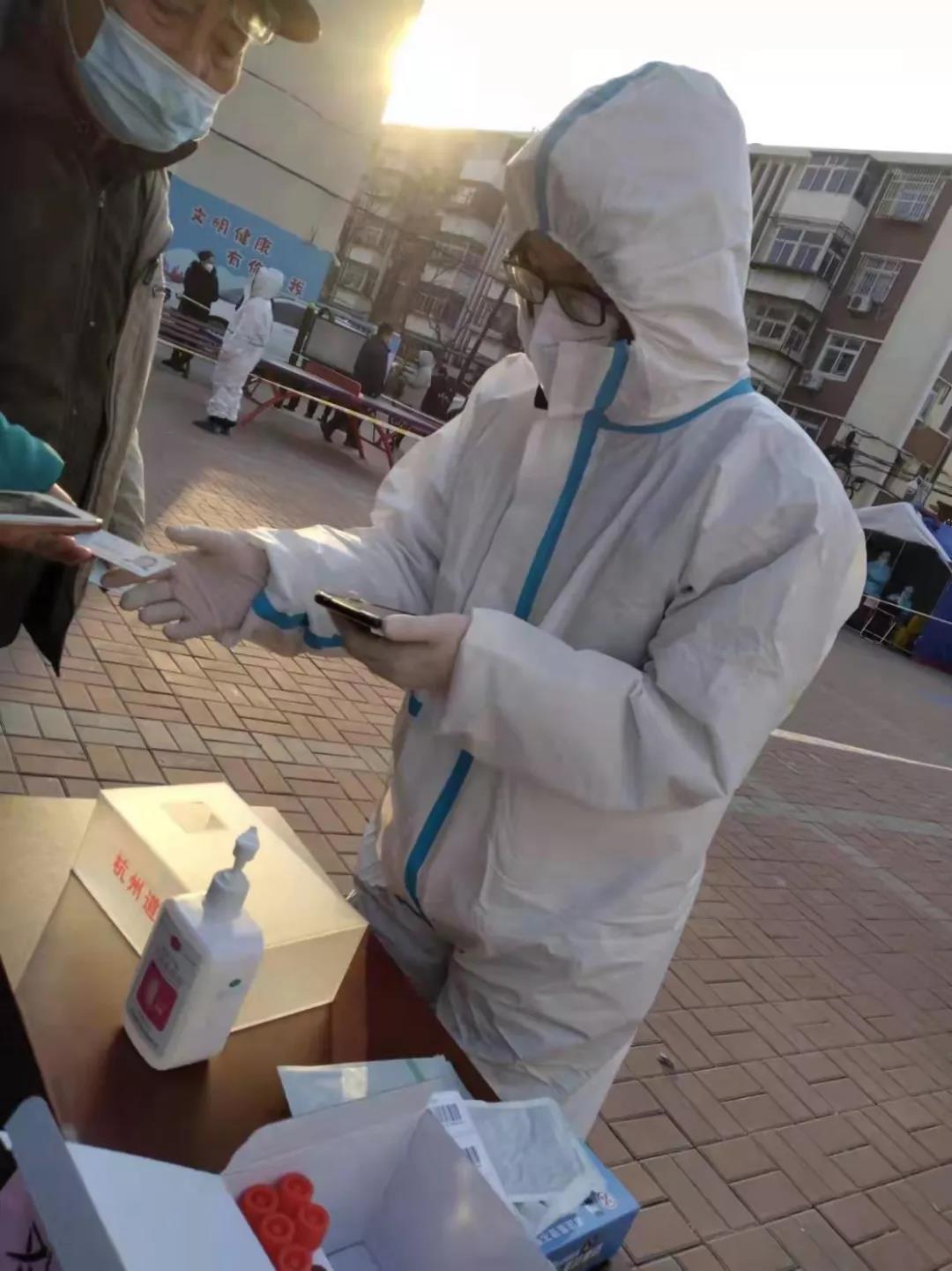 沈海洋也加入了这场“战疫”中,他是2021级油气储运工程专业的一名学生,返回家乡天津后,面临疫情,他积极响应号召,第一时间报名参加了社区志愿者。作为一名青年团员,他不畏严寒、闻令而动、星夜出征,穿上红马甲、防护服,全力投入疫情防控第一线,参与到社区核酸大筛工作中。早上不到5点就开始布置点位,张贴标识,6点核酸检测开始,他熟练地给检测的居民登记、消毒、维护秩序,用细心、耐心的工作态度,为居民们带来热心的服务。身为一名天津人,他时刻不忘回报家乡,作为石油学子,在大庆精神的孕育,铁人精神的滋养后,更加使他产生了身为石油人的不怕苦不怕累的精神。
