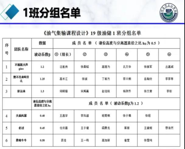 根据工况数据、设计要求、计算要求,将19级油储1班34人,分为6个小组,小组中每个成员都有自己的担当,学生自主命定团队名称,分别为:不服就大声giao、想不出来叫什么、好运来、头脑风暴、必过、勇敢牛牛团队,每名同学都积极参与到设计之中。