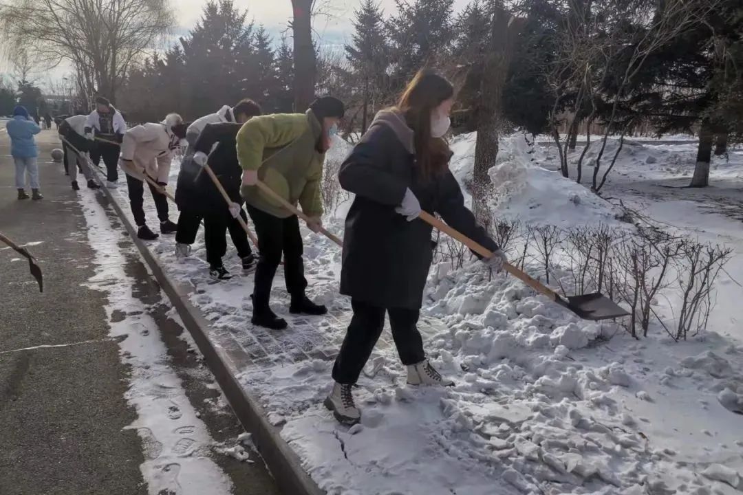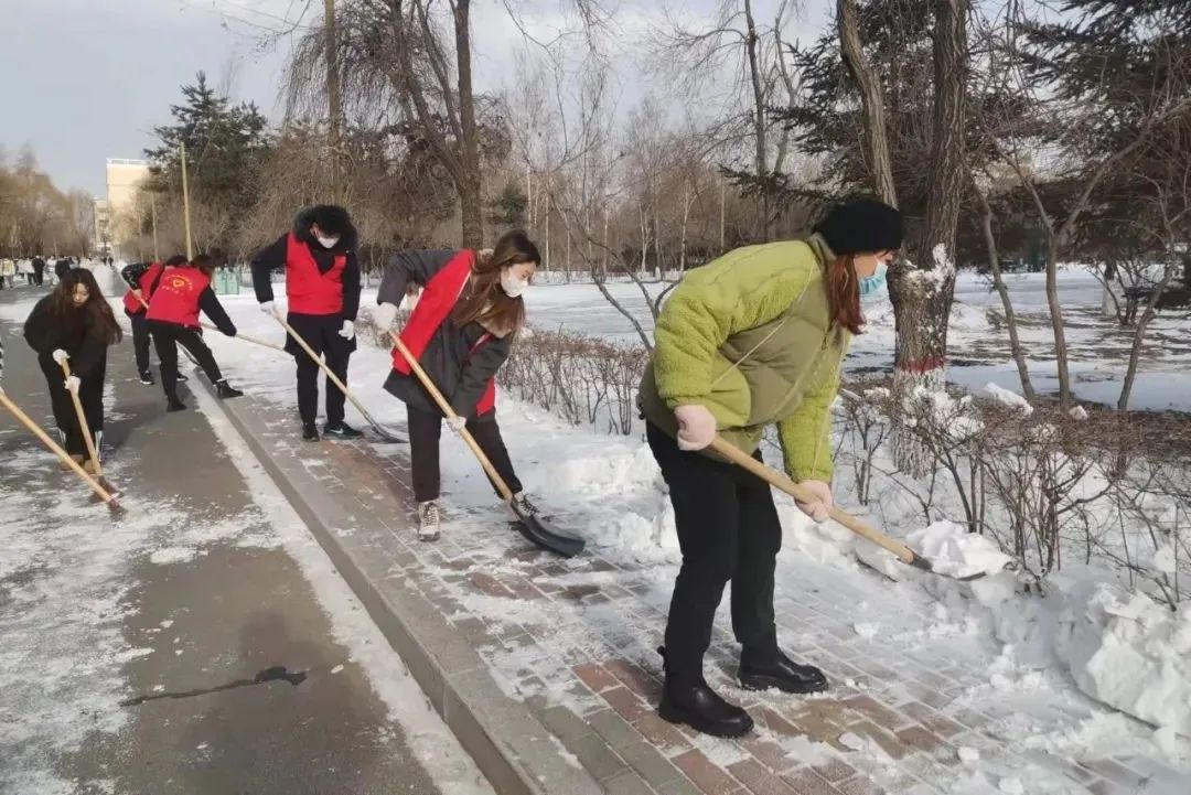 “一夜北风紧,开门雪尚飘。”2021年11月25日,哈尔滨又一次降雪,伴随着寒潮,给冬日的校园裹上了银色的衣装。初雪美景给同学们带来欣喜的同时,道路积雪也给校园安全出行带来了隐患。为保障校园安全,方便师生出行,石油工程学院青年志愿者协会组织志愿者有组织、有纪律地开展扫雪活动,齐心协力清除路面积雪,确保师生出行方便、安全。