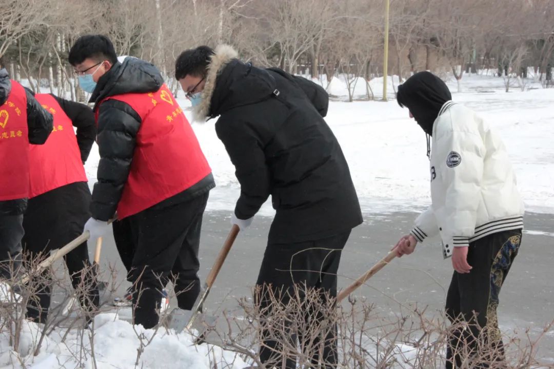志愿者们不畏严寒,纷纷拿起铁锹、扫帚等除雪工具,来到宿舍楼门口,和校园里的马路上,扫积雪、铲冰层、清杂物、除路障。把同学们出行的必经之路清扫的干干净净,极大的方便了同学们的交通出行,确保了同学们的安全。在寒冷的气温下,大家井然有序,没有叫苦叫累。忙碌的身影构成了一道亮丽的风景线。经过一小时的清扫,校园里的积雪基本清理干净,为师生创设了出行方便、安全畅通的道路。