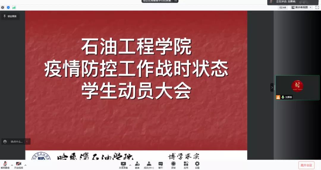 会议还强调以下几点:一、增强疫情防控的责任感,时刻紧绷思想之弦,积极开展好本院疫情防控,要求做到“非必要不出校、非必要不离哈”。二、加强个人防护,做到不传谣,不信谣,严格遵守官方政策及公告,不发布任何未经官方证实的虚假信息和言论,扎实做好疫情防控工作。三、凝“心”聚力,多点发力,筑牢抗“疫”心理防线。疫情防控期间,扎实推进落实疫情防控期间学生心理健康教育工作。学生可通过微信、电话联系辅导员,双方实现一对一谈话全覆盖,给予学生关怀与心理支持。
