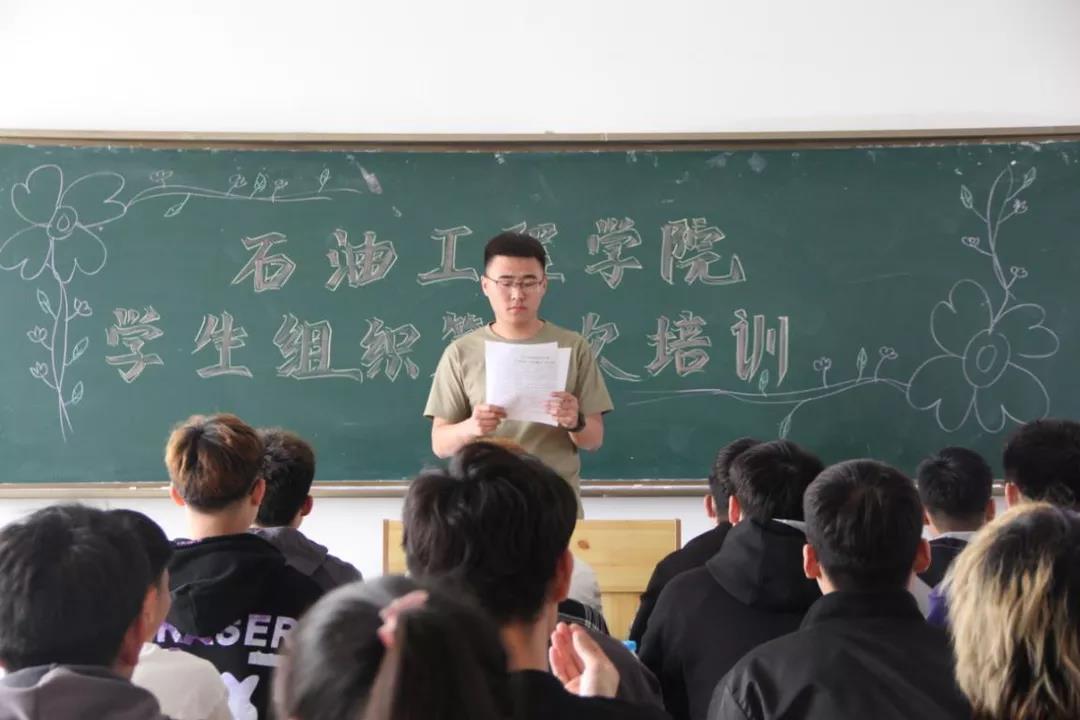 为深入学习习近平总书记致全国青联十三届全委会贺信精神,进一步加强学生组织的凝聚力,增强学生干部的归属感,石油工程学院于4月16日至4月20日期间组织全体学生组织干部在主教学楼702教室陆续开展三次培训会,会议由我院学生会主席王贵棋主持。学生会全体学生干部参加培训。