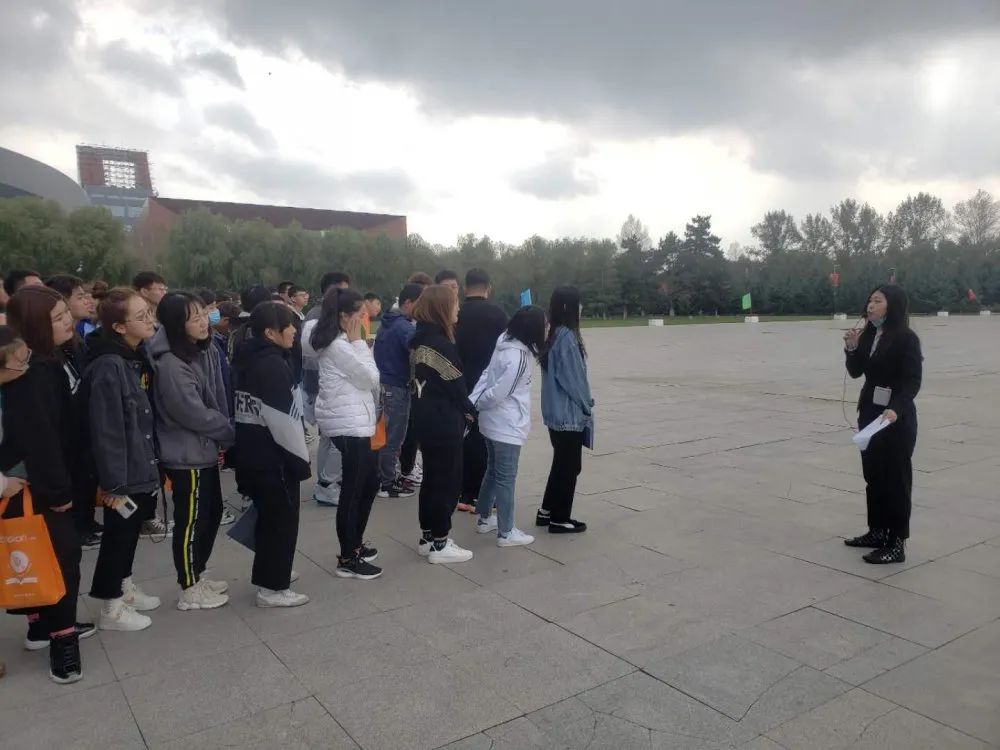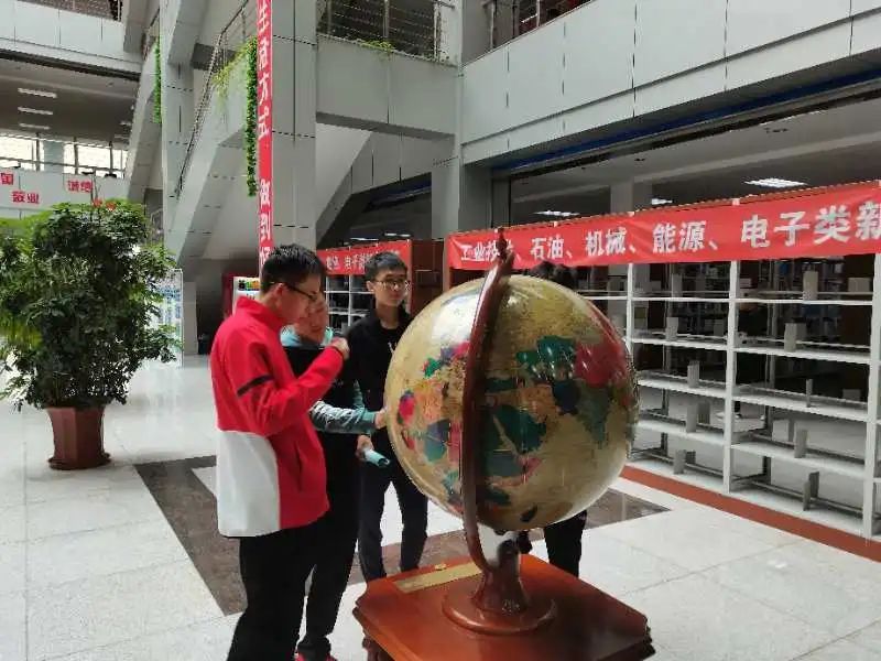 上午九时,秋空高朗,同学们在主教学楼前集合完毕,位处铁人广场,眼前的主教楼就是平时同学们上课的地方。参观过广场中央的校训,认识了“磕头机”后,同学们顺着求知南路走过行政楼、致知中路的艺术楼、悦心坪,来到了坐落于格物西路的图书馆。