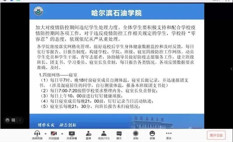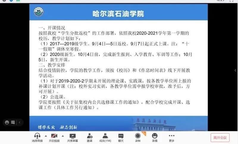 为了全面做好2020年秋季学期开学学生返校工作,结合学校疫情防控工作需要,我院于2020年9月6日通过腾讯会议app,给学生上了开学第一课,石油工程学院全体学生参加本次会议。我院党总支书记刘雁春担任主讲人。