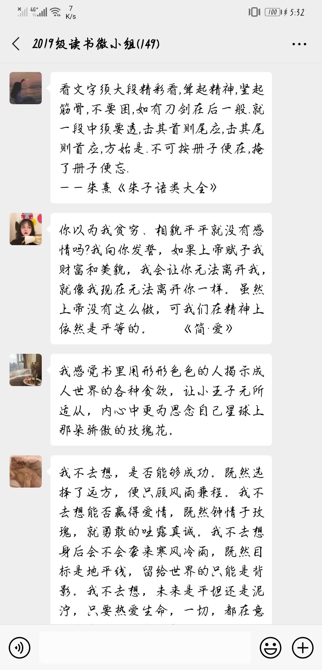 读书小组的成立,不但在我院营造了良好的读书氛围,让同学们在读书中学习知识。而且能够通过这样的方式养成在今后的生活工作中热爱读书的优秀品质。目前由于疫情原因,学生大部分时间都在进行网课学习,通过成立读书小组,也让学生能够分享自己认为有趣的书来缓解学习压力,并形成了学生与师生之间相互碰撞思想、启迪思维、取长补短、增进了解,构建“一起学习、相互交流、共同进步”的良性机制。