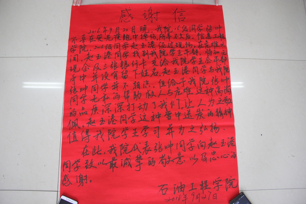 为感谢赵玉港同学这种乐于助人,奉献爱心的高尚品德,27日下午,院学生会主席程海瑶与受伤同学的室友一起来到信息工程学院学工办,专程向赵玉港同学送交了感谢信,并当面表达谢意。