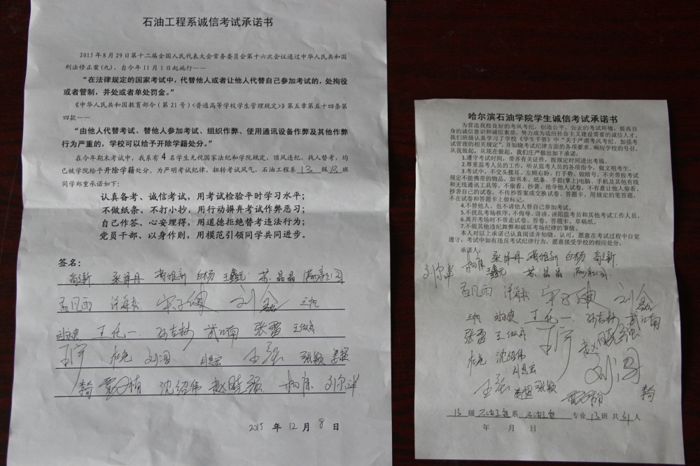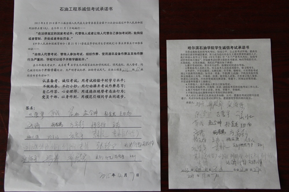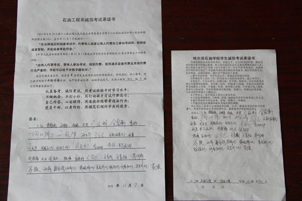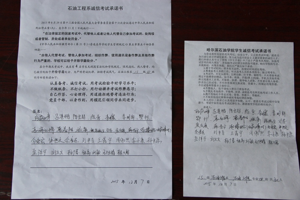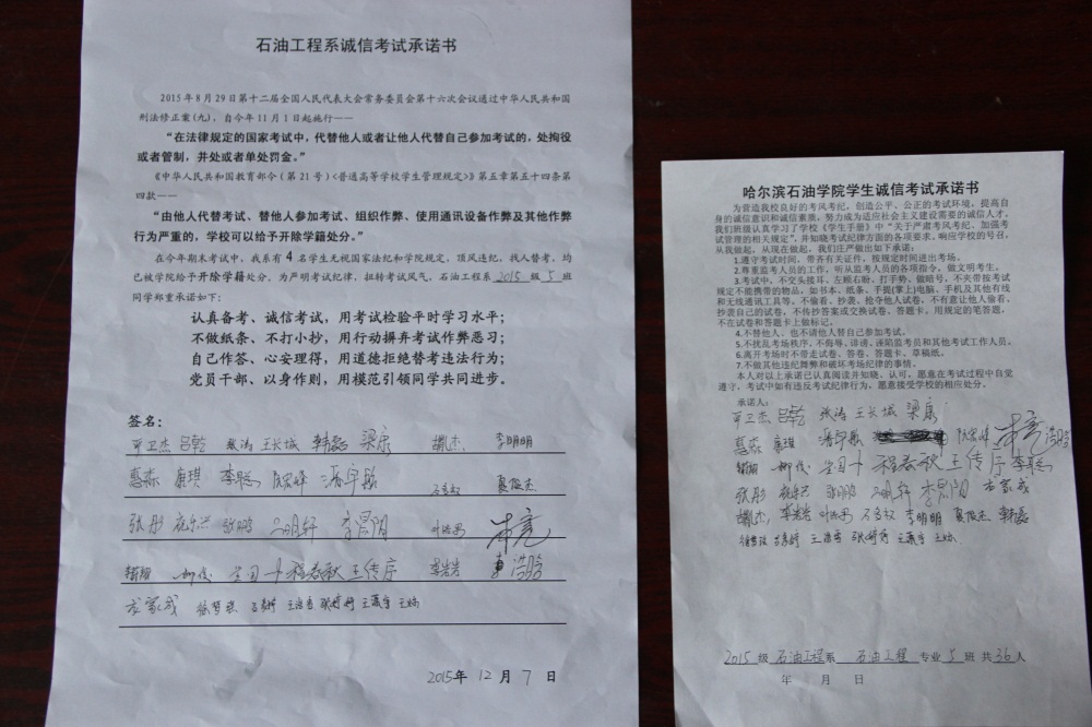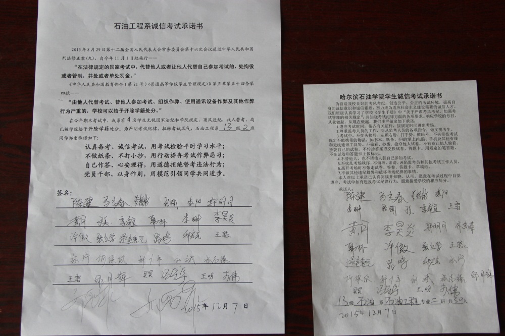 石油工程系要求班级每名学生同时在学院和系印发的考试承诺书上签名,在外实习的学生也要指定专人代替签字,做到不漏一人。同时,在考试这项工作上做到“两个绝不”:在考试违纪的问题上,绝不包庇护短,绝不回避问题。对出现问题的学生,坚决支持学院有关部门依纪依规做出严肃处理,为学院学风考风建设保驾护航。