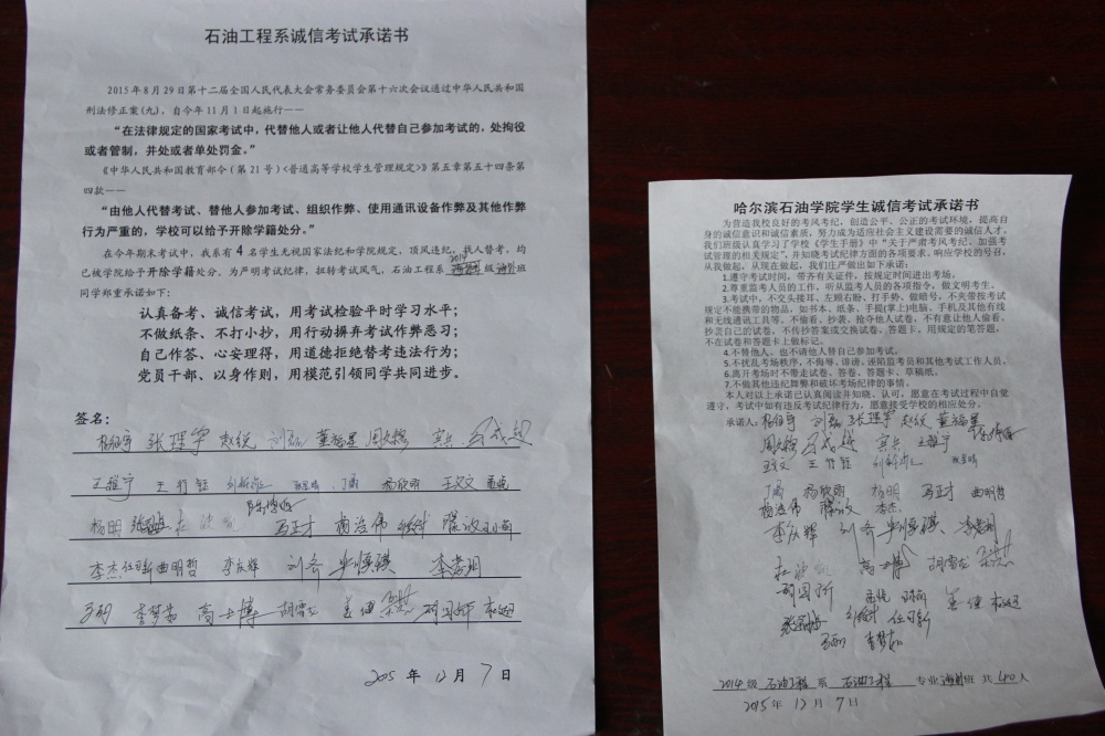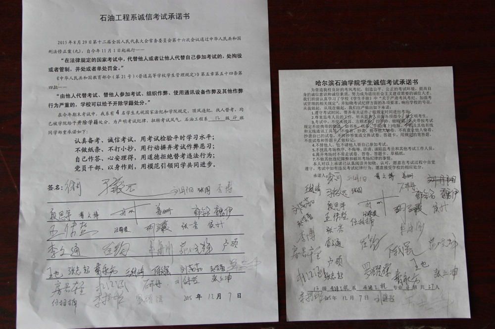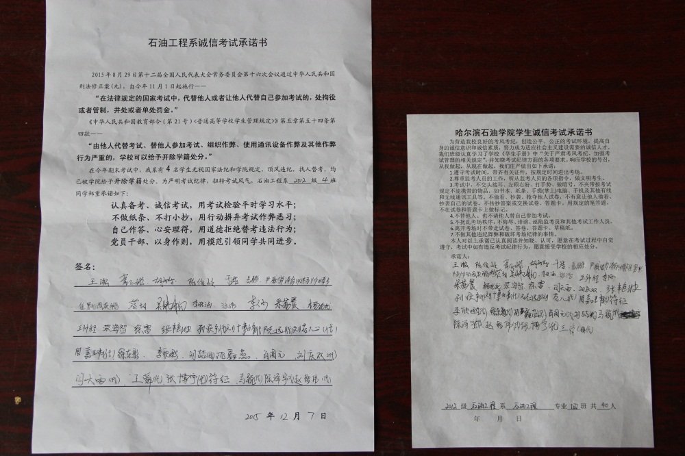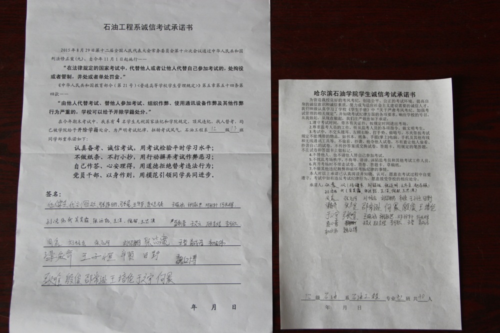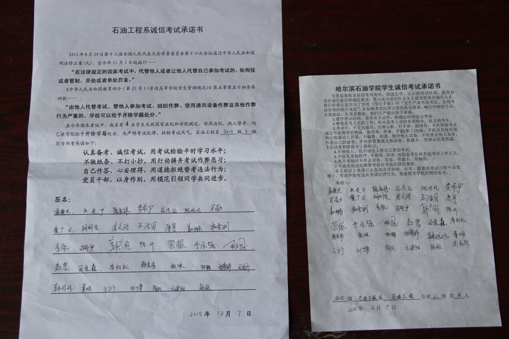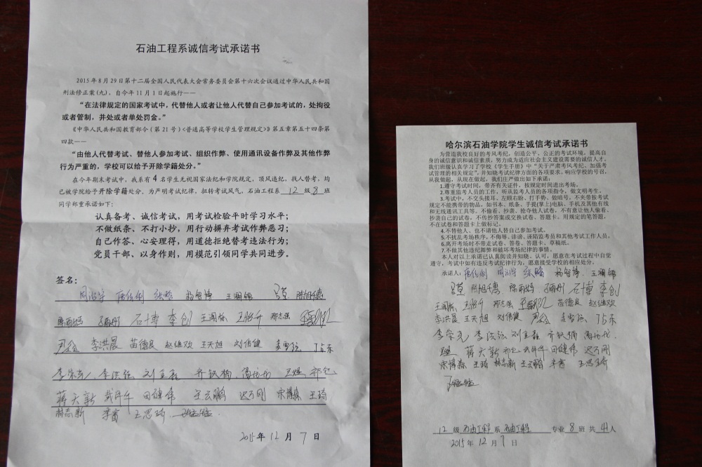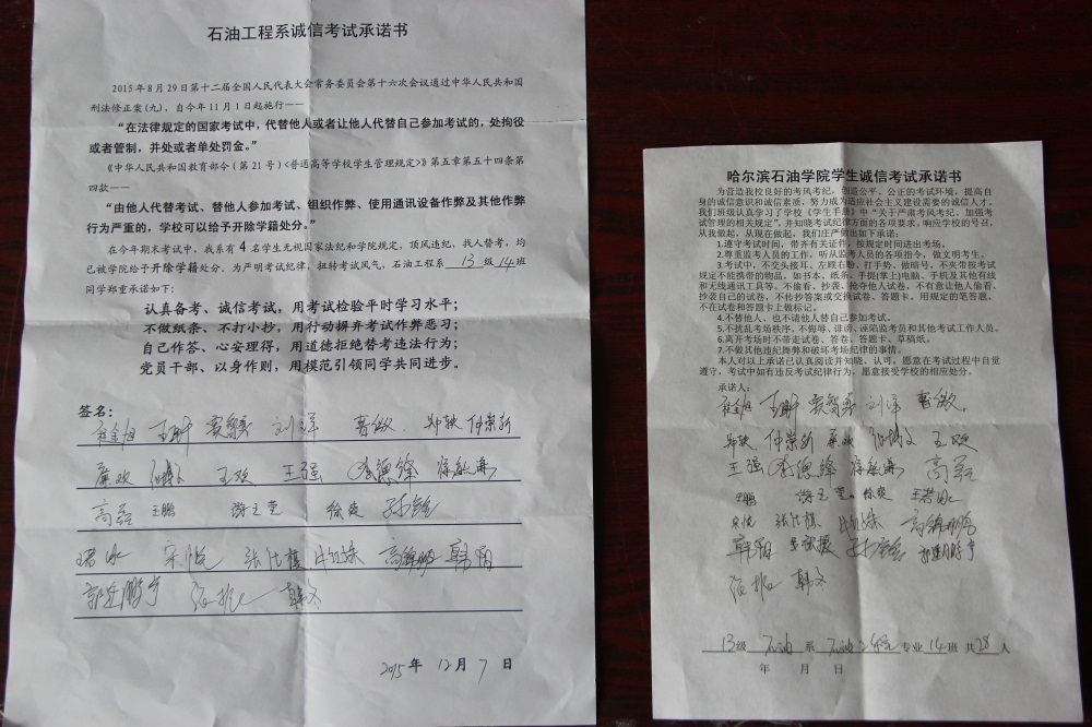 石油工程系要求班级每名学生同时在学院和系印发的考试承诺书上签名,在外实习的学生也要指定专人代替签字,做到不漏一人。同时,在考试这项工作上做到“两个绝不”:在考试违纪的问题上,绝不包庇护短,绝不回避问题。对出现问题的学生,坚决支持学院有关部门依纪依规做出严肃处理,为学院学风考风建设保驾护航。