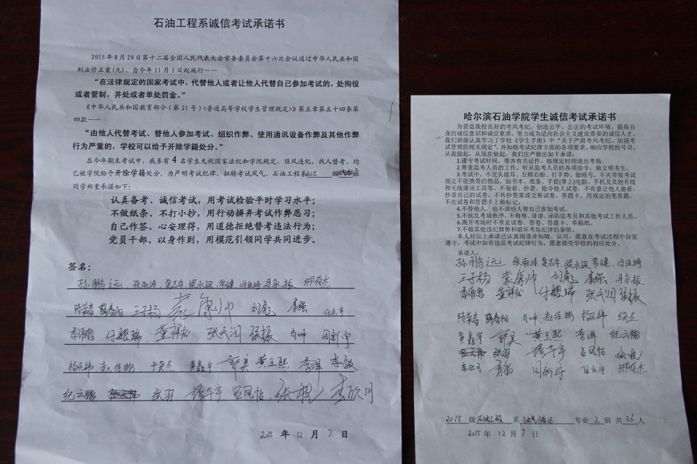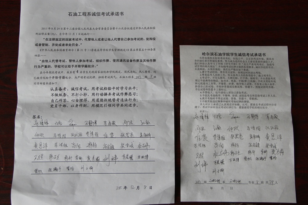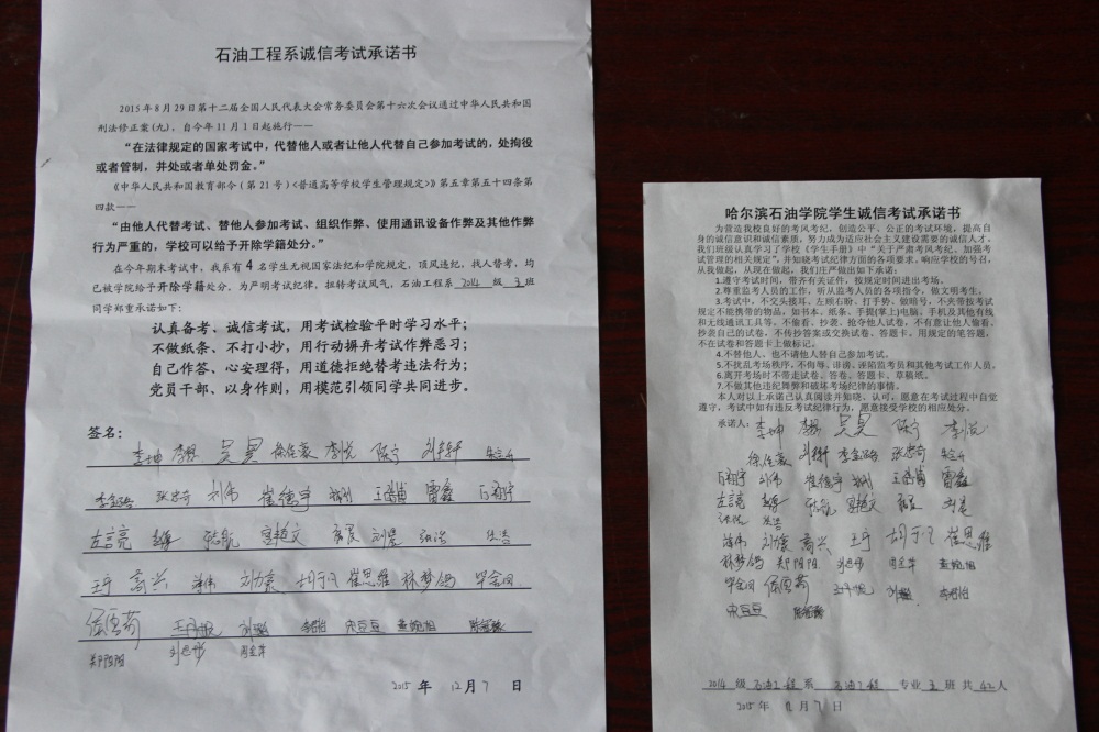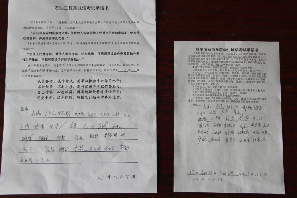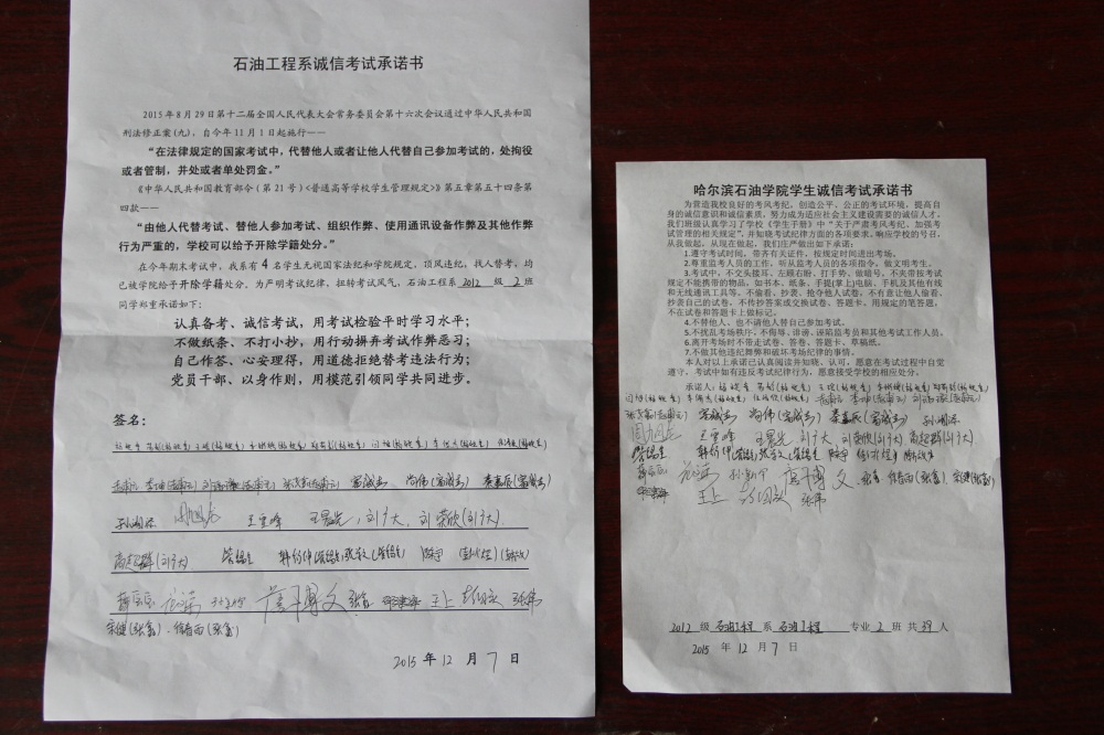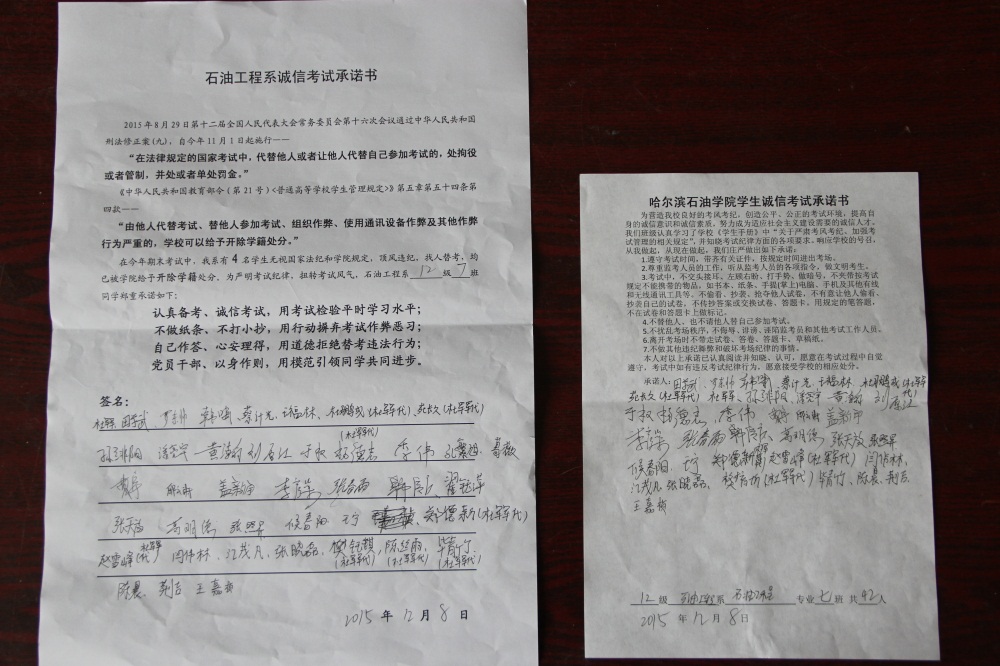 石油工程系要求班级每名学生同时在学院和系印发的考试承诺书上签名,在外实习的学生也要指定专人代替签字,做到不漏一人。同时,在考试这项工作上做到“两个绝不”:在考试违纪的问题上,绝不包庇护短,绝不回避问题。对出现问题的学生,坚决支持学院有关部门依纪依规做出严肃处理,为学院学风考风建设保驾护航。