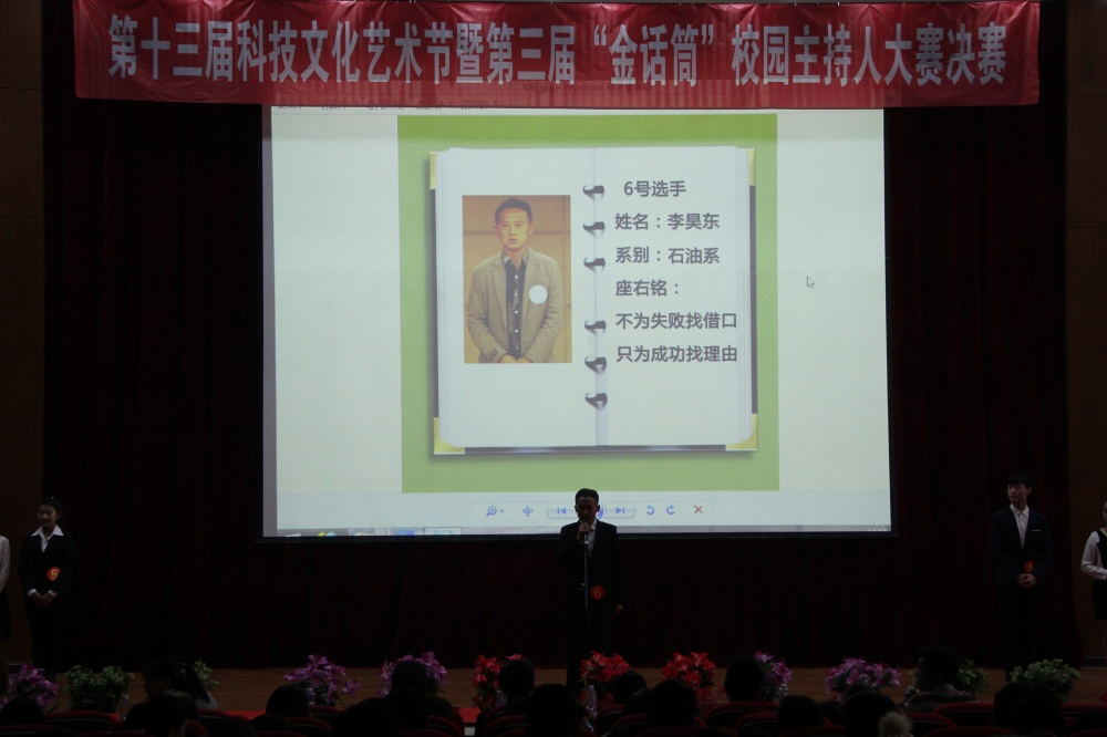 11月3日下午两点,由欧博abg游戏登录入口党委宣传部和共青团哈尔滨石油学院委员会主办,欧博abg游戏登录入口传媒系承办的第三届“金话筒”校园主持人大赛决赛在图书馆报告厅圆满落幕。新浪网主持人王杰卿,凤凰网主持人彭博,东北网主持人李楠和欧博abg游戏登录入口团委书记王锦石担任本次大赛的评委。