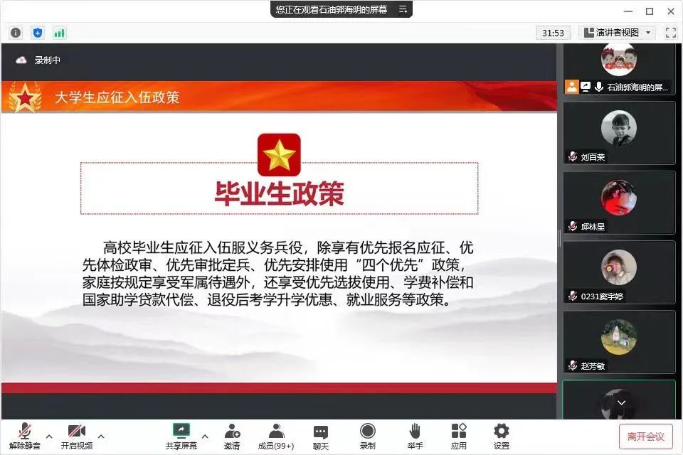 随后,郭老师就同学们的问题进行解答,并分别从参军应征指南、参军优待政策、国家教育资助申请流程等方面展开宣讲,为学生详细解读国家征兵政策,介绍征兵流程、体检和政治条件及应征入伍注意事项。