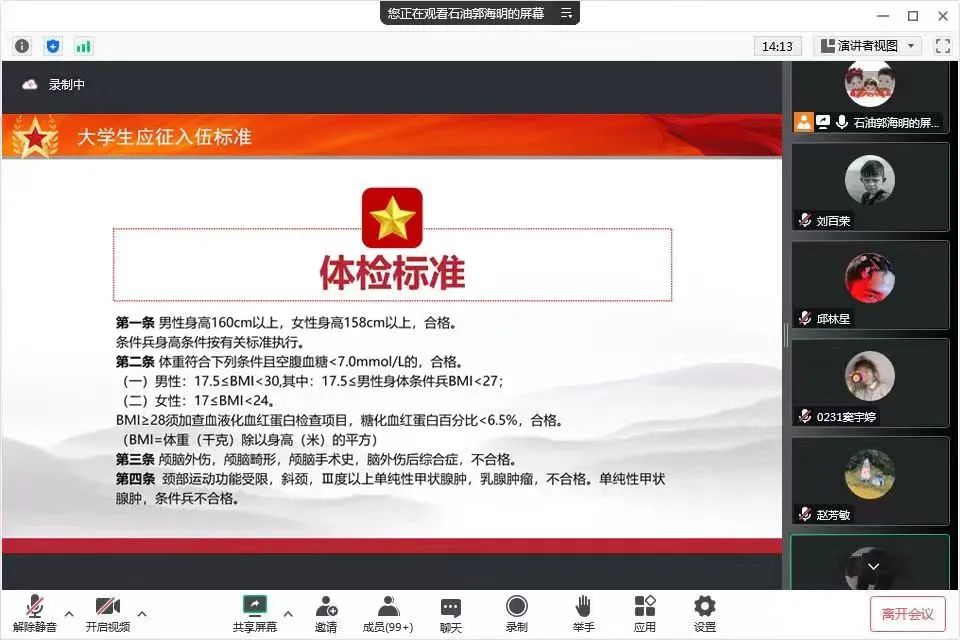 会上,郭海明辅导员强调,征召大学生参军入伍是党中央、国务院、中央军委作出的重大战略决策,对改善兵员素质、提高部队战斗力、促进青年学生的成长成才具有非常重要意义。青年大学生一定要充分认识,当兵入伍,保家卫国是我们的神圣职责,积极响应党和政府的征兵号召,把个人理想抱负融入强军梦、中国梦,踊跃报名应征,到部队中成长和锻炼自己,为国防事业贡献力量,为国为家争光接着从学生的理想抱负、入伍目的鼓励适合条件的学生参军入伍。