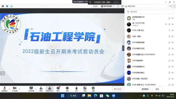 为帮助学生树立正确的学习观念,端正考风考纪,引导学生做好大学规划和期末复习安排。12月8日晚,我院召开线上期末动员大会。由22级辅导员尹航主持会议,石油工程系主任胡旭和油气储运工程系主任于子丰主讲,2022级全体新生参加。