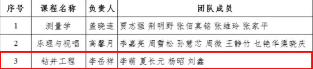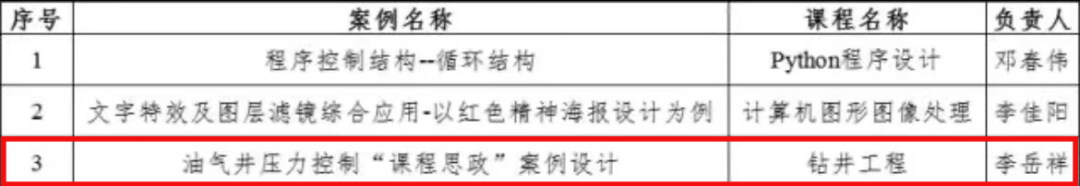 近日,由我院李岳祥院长带领李萌、夏长元、杨昭、刘鑫老师组成的教学团队打造的《钻井工程》课程入选“黑龙江高校第三批课程思政示范培育项目”,李岳祥院长《油气井压力控制“课程思政”案例设计》入选首批课程思政优秀案例。黑龙江高校第三批课程思政示范课程