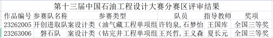 第十三届中国石油工程设计大赛——方案设计赛项已落下帷幕,我院师生在本次大赛中再创佳绩,由夏长元老师指导的学生团队在钻完井工程单项组荣获国家三等奖、由王国库老师指导的学生团队在油气藏工程单项组荣获国家三等奖,共斩获国家奖项二项。