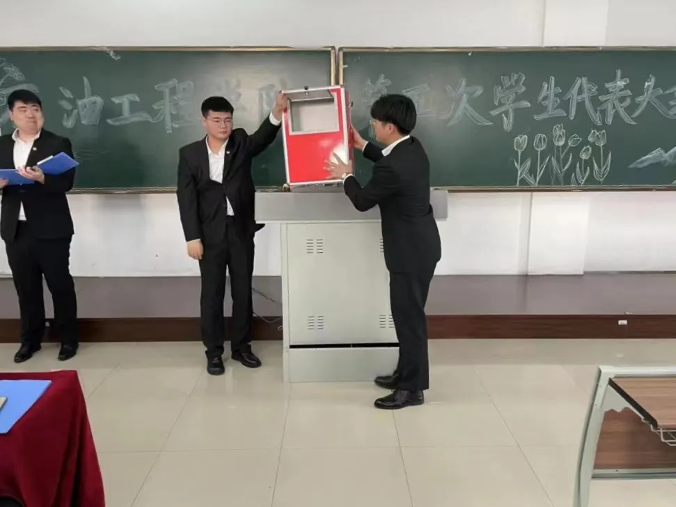 最后,会议投票选举校学代会委员代表和石油工程学院学生组织主席团,为保证投票公平公证,由苏志超和金国志进行监督投票。