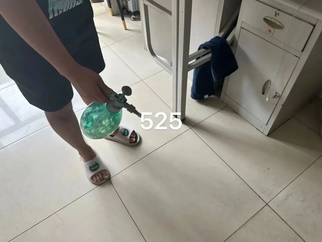 消杀过程中,志愿者对每一间寝室逐一开门、开窗通风,对地面、卫生死角喷洒消毒液,仔细对每一处卫生死角清洁消毒,努力做到消毒全面,以消除病菌。