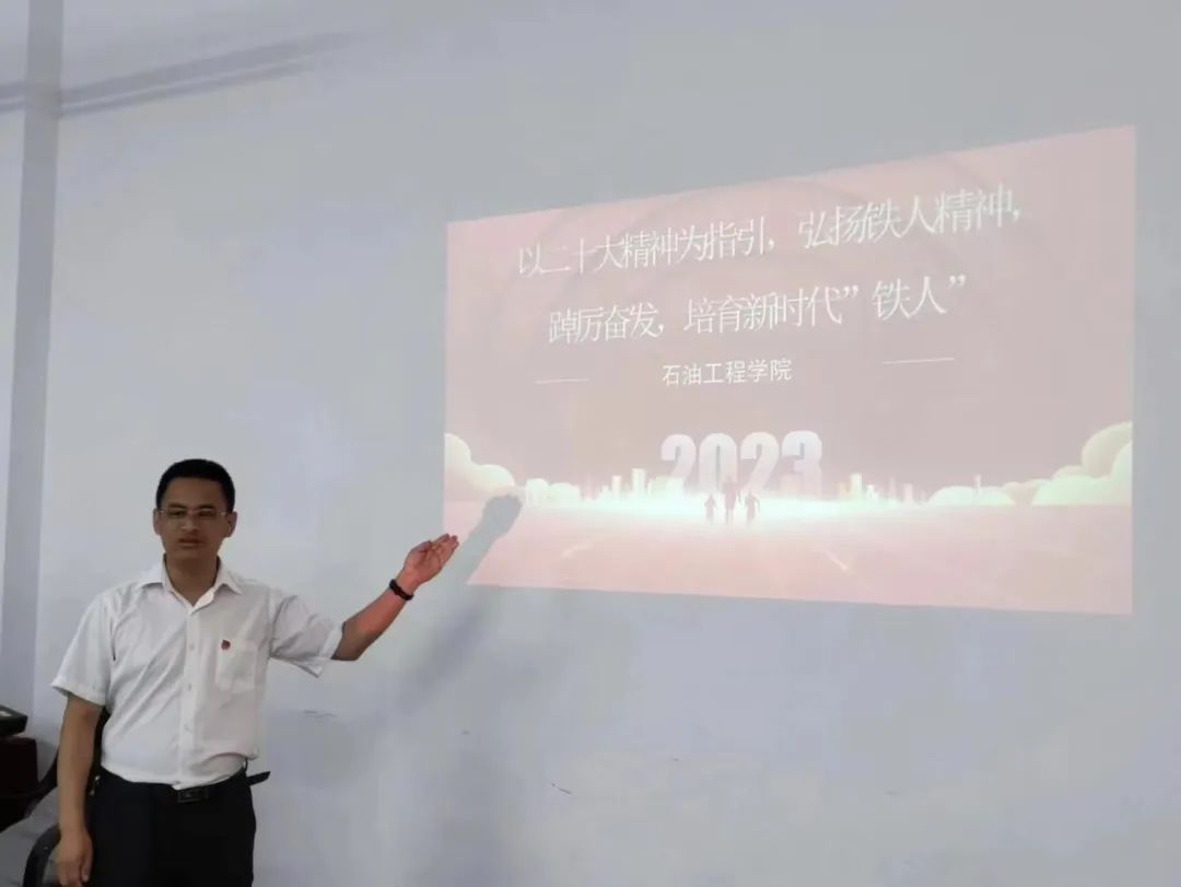 在党课中,党总支书记刘雁春首先带领与会党员重温了党的二十大精神的有关内容,随后他讲授了大庆精神、铁人精神的来源、发展脉络、核心内涵等。刘书记强调,一是要以学习贯彻习近平新时代中国特色社会主义思想主题教育实施方案要求,扎实学习贯彻习近平新时代中国特色社会主义思想,在今后的工作中要增强党员立足岗位“奋进新征程、建功新时代”的责任心和使命感,将以党的二十大精神为指引,踔厉奋发,锐意进取,不断提高政治判断力、政治领悟力、政治执行力,增强“四个意识”、坚定“四个自信”、做到“两个维护”,始终在思想上、政治上、行动上同党中央保持高度一致,做到心往一处想、劲往一处使,共同把党锻造成一块攻无不克、战无不胜的坚硬钢铁;二是要牢牢把握“学思想、强党性、重实践、建新功”的总要求,在今后的学院建设中,党员师生要带头深入学习贯彻党的二十大精神,从大庆精神、铁人精神中汲取奋进力量;三是要将学习铁人精神转化为推动学院高质量发展的强大动力,扎实做好学院的各项工作任务,为培育石油行业人才提供优质保障,让铁人精神在学院教育、工作中落地生根、开花结果。
