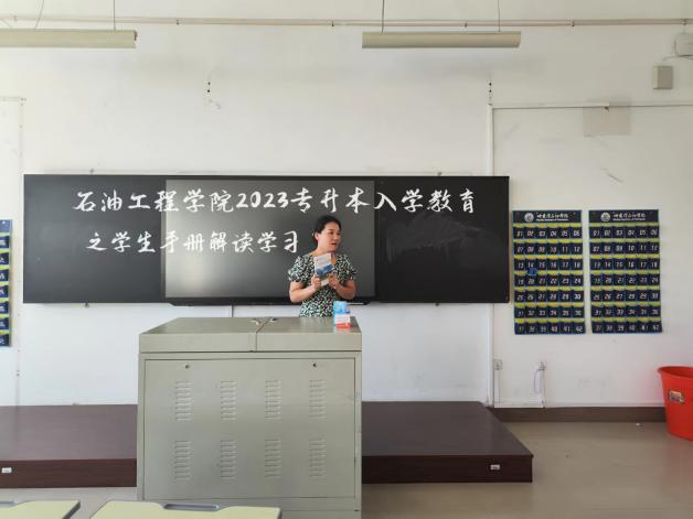 为更好地促进专升本学生对学校生活的适应熟悉并加强遵规守纪的意识,营造良好的学习氛围,2023年8月24日,石油工程学院在主教召开2023级专升本入学教育之学生手册解读学习主题班会,会议由2023级专升本辅导员、学生党支部书记王娜主持,全体专升本学生参会。