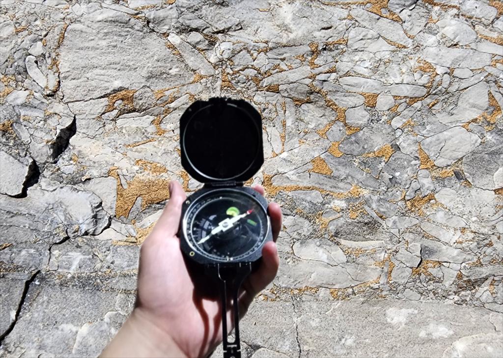 来到今天第五个观测点:上台阶垭口。观察:盆地东为冶里组砾屑灰岩,西为亮甲山组黄斑豹皮灰岩。同学们在这里学习了罗盘的使用方法,测量了岩层产状。